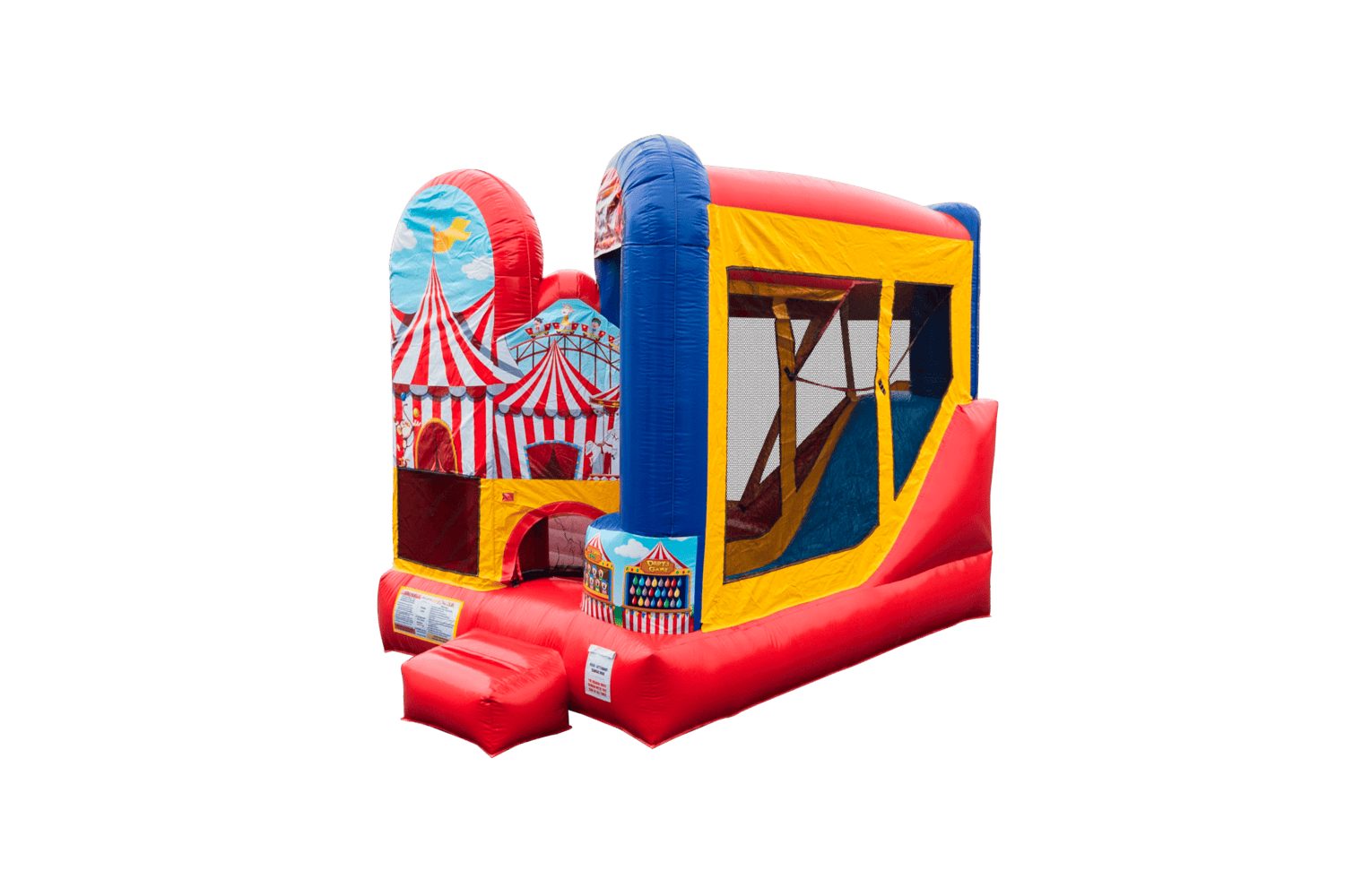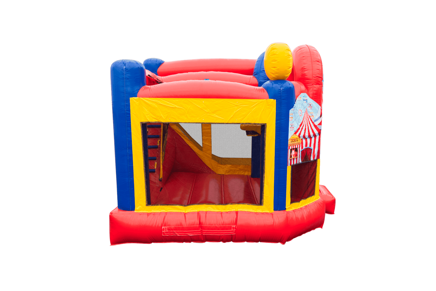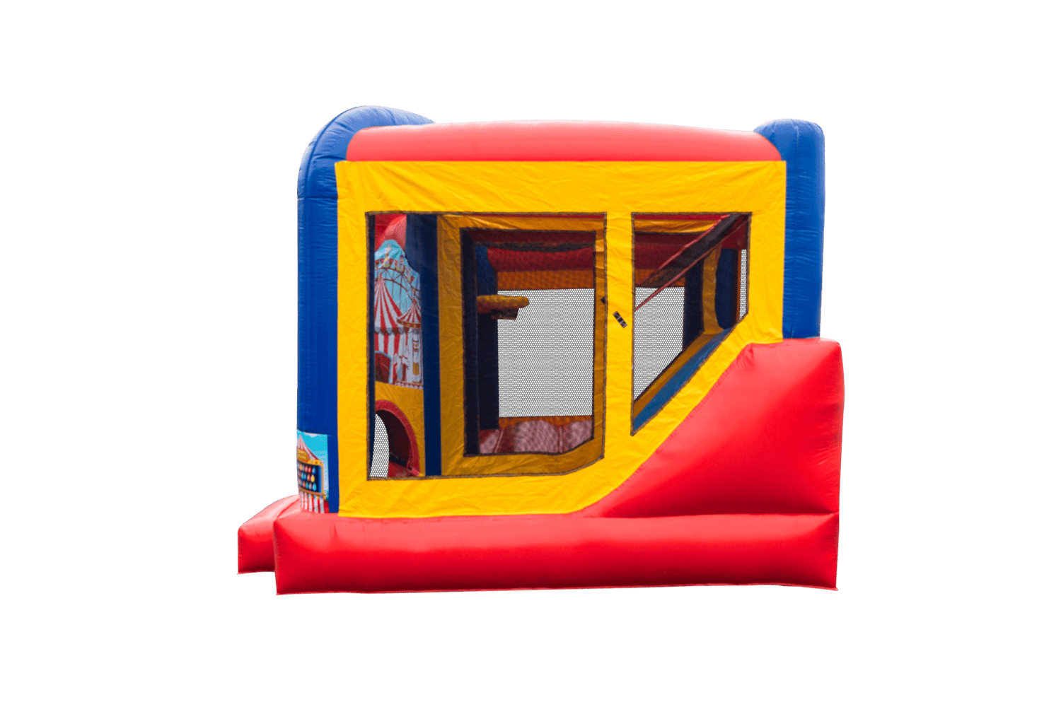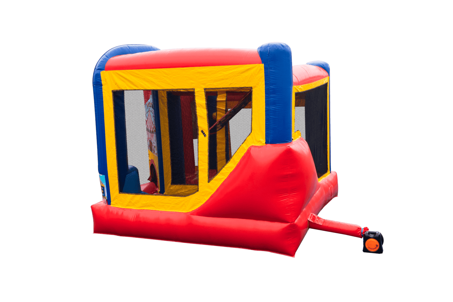 The Backyard combo style bounce house is the ultimate in inflatable jumpers! The large interior jumping area offers a basketball hoop. This bouncy castle has a climb feature and a convenient exit slide for hours of active fun! Parents and spectators are offered a clear view with the 360-degree mesh sides of this moonwalk. The Backyard combo bounce house is made of lite n strong™ fire-resistant vinyl for safety, durability and easy portability. This Backyard bouncy house is sure to make any indoor or outdoor event a great success!