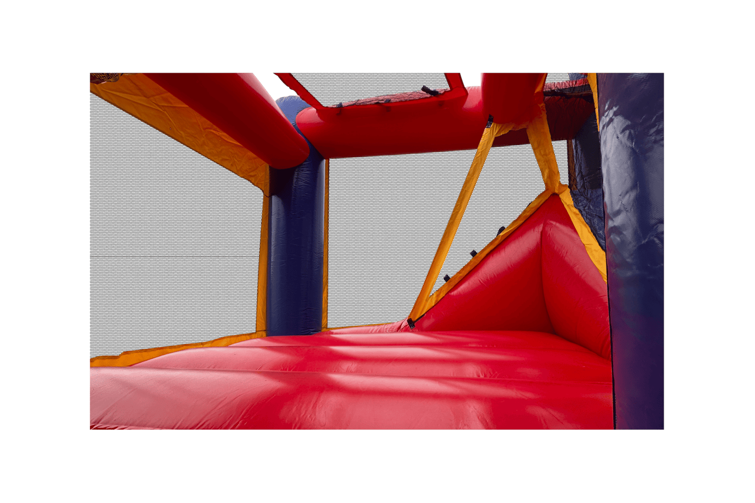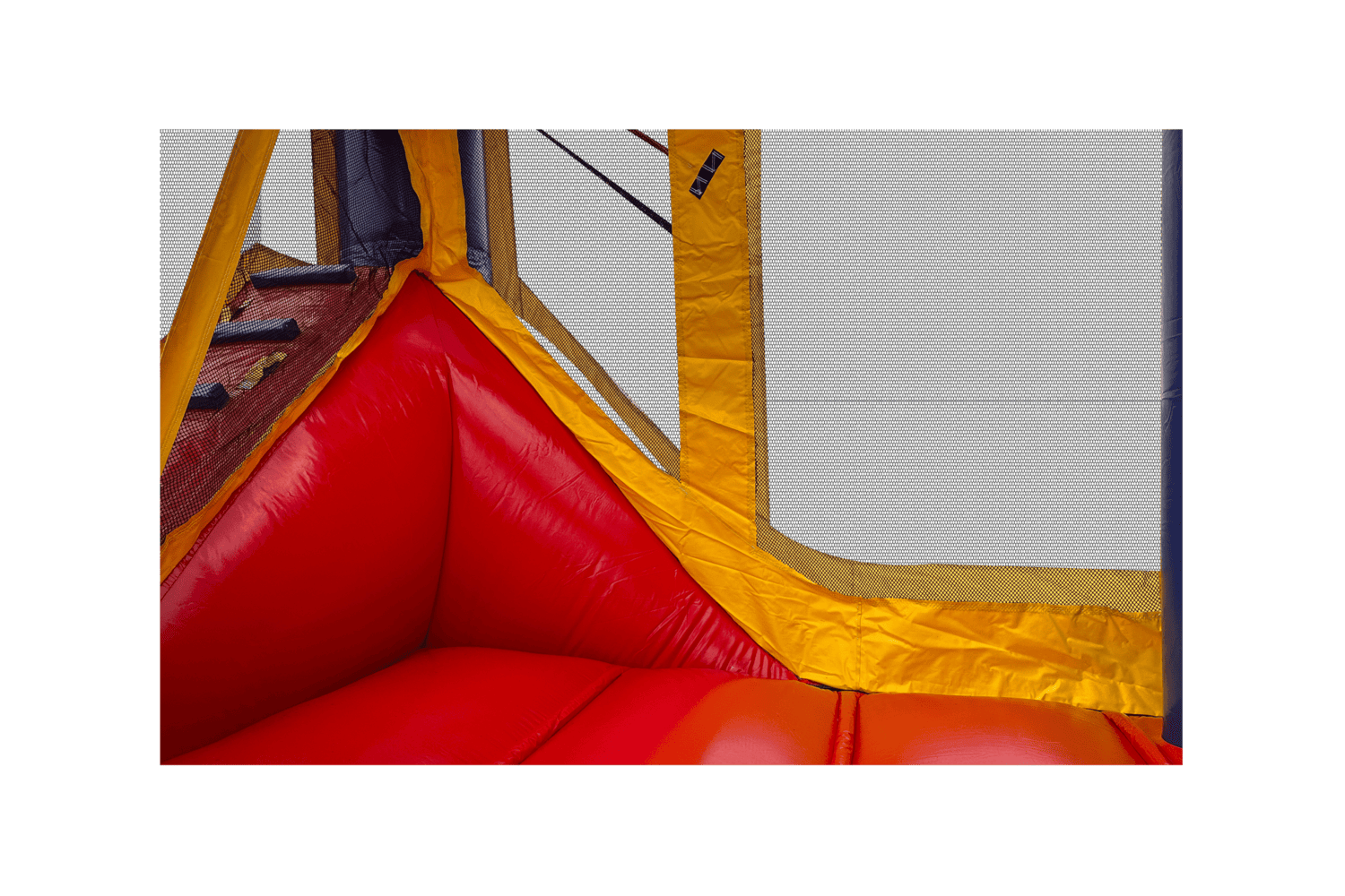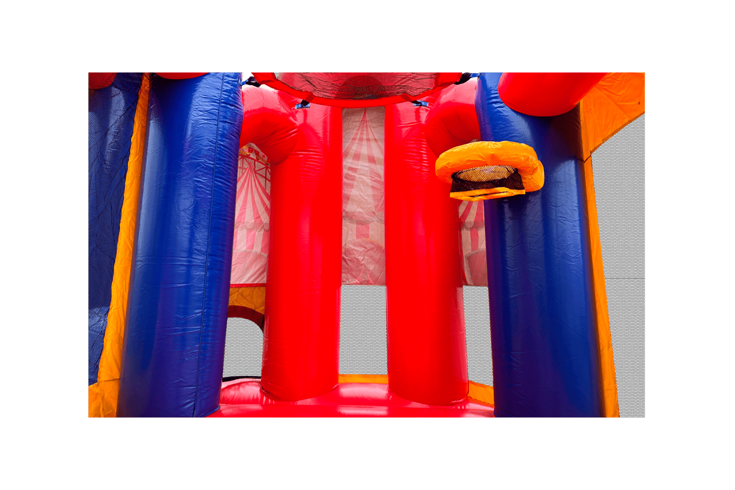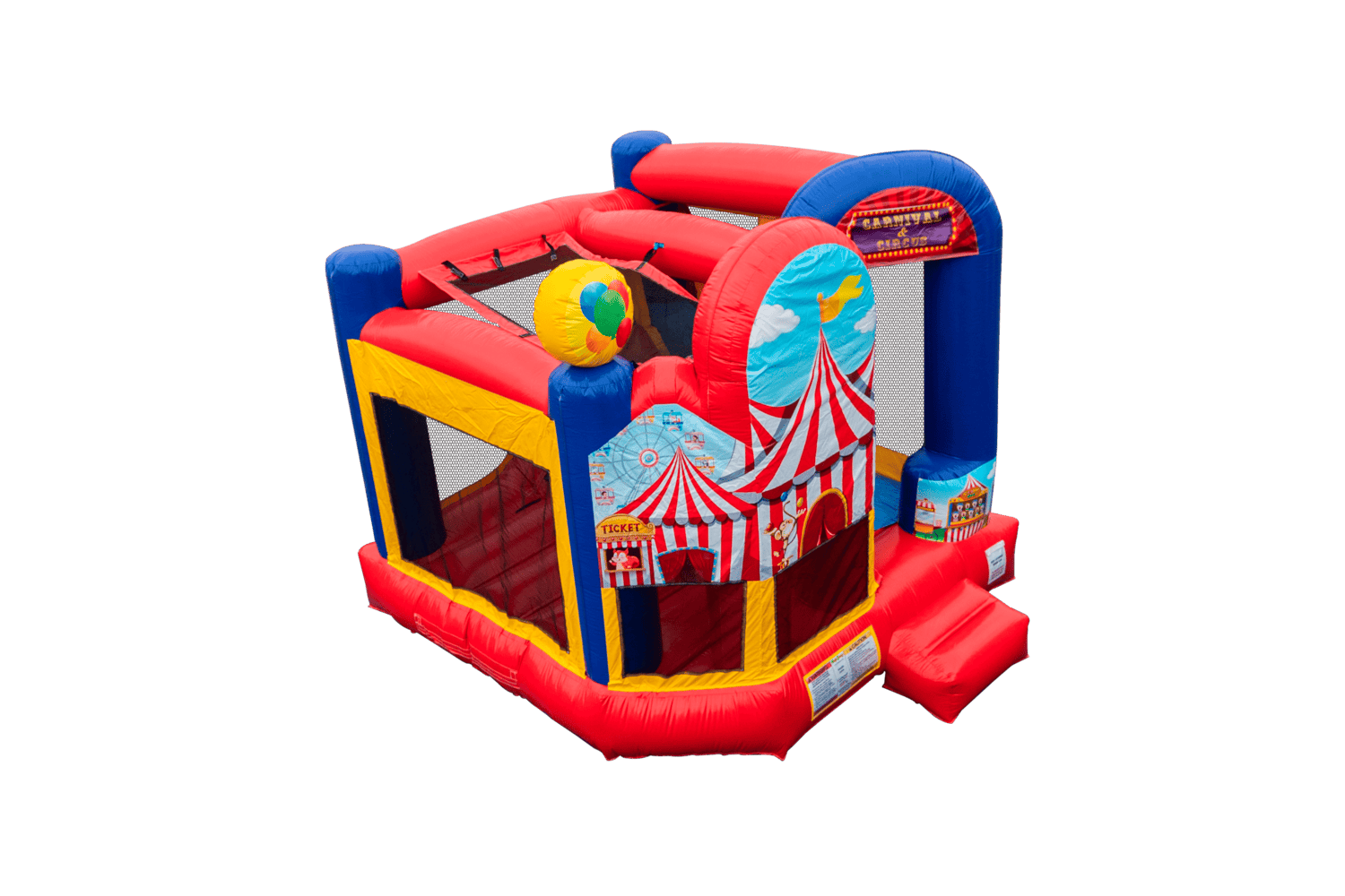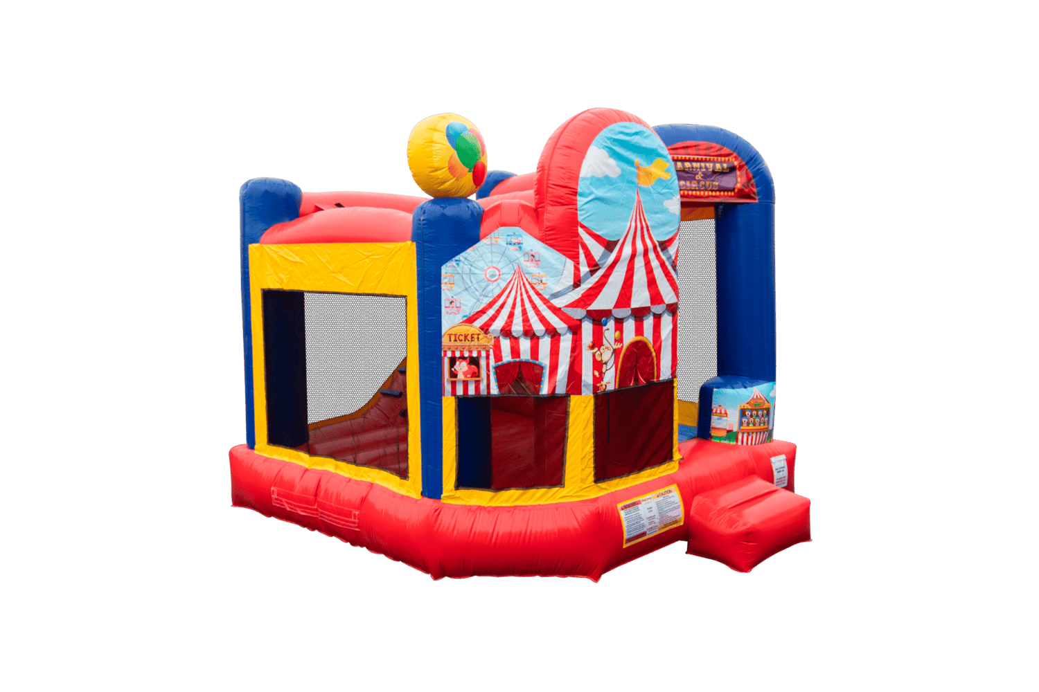 The Backyard combo style bounce house is the ultimate in inflatable jumpers! The large interior jumping area offers a basketball hoop. This bouncy castle has a climb feature and a convenient exit slide for hours of active fun! Parents and spectators are offered a clear view with the 360-degree mesh sides of this moonwalk. The Backyard combo bounce house is made of lite n strong™ fire-resistant vinyl for safety, durability and easy portability. This Backyard bouncy house is sure to make any indoor or outdoor event a great success!