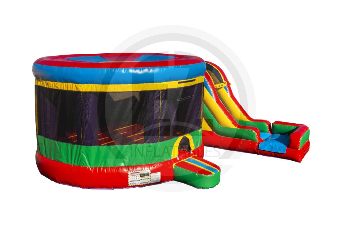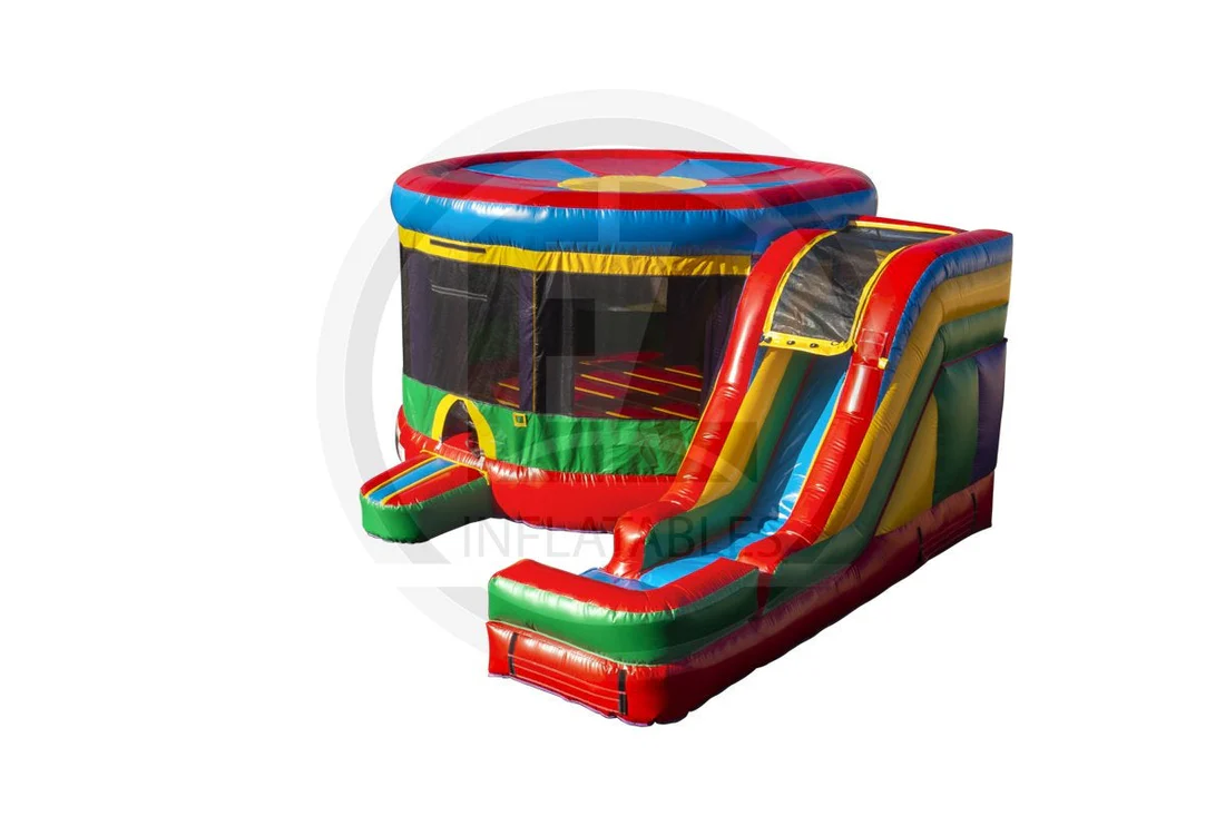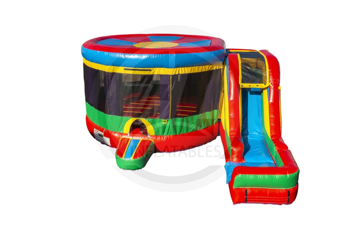 Our large combos are built for people who want to add a WOW factor to their events. With a large slide, huge jumping area, basketball hoop, and option to be used wet or dry, the Round Indoor Combo-C1074 has all the elements you need to have some serious fun.